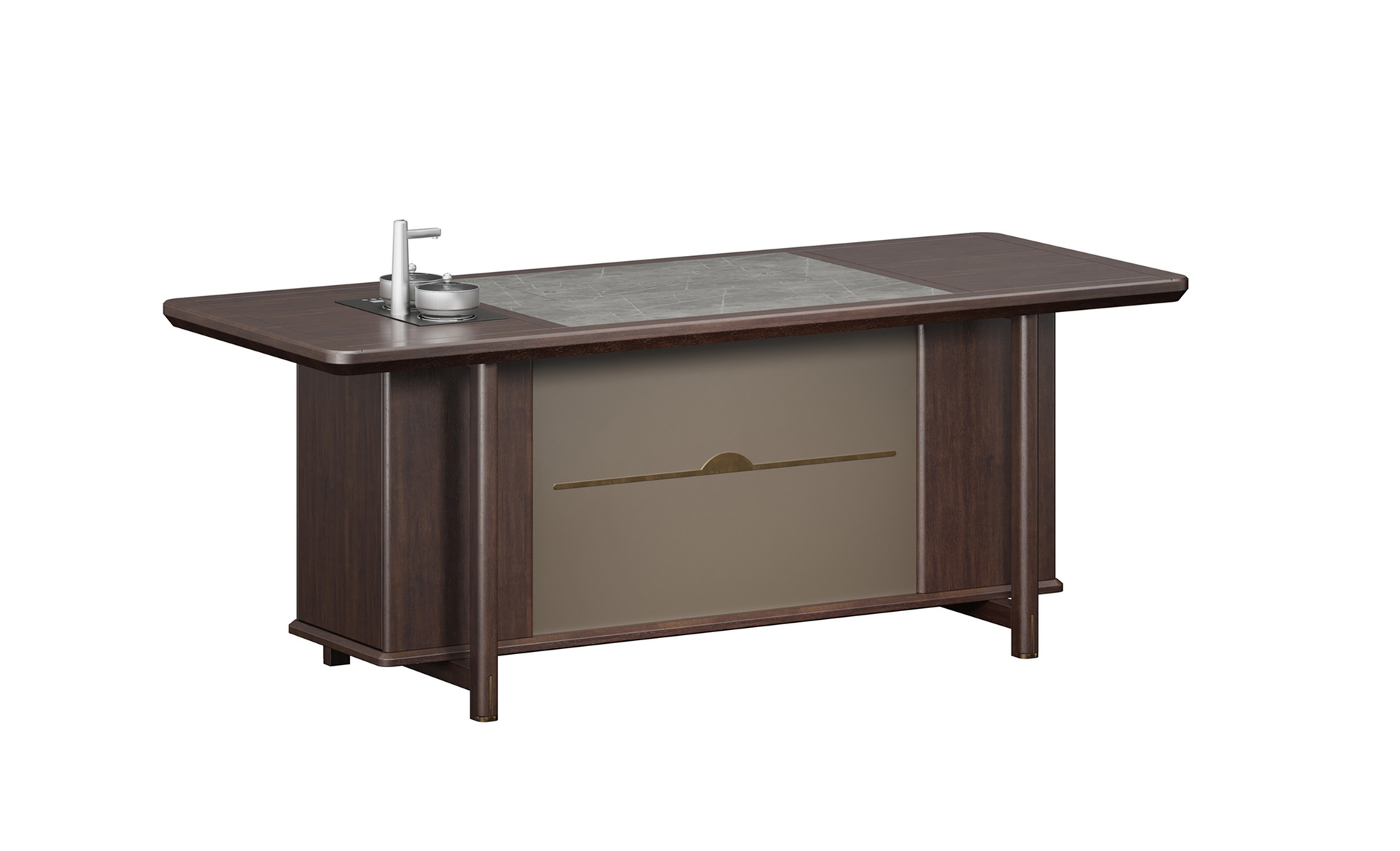 鸿泰系列在造型上主要采用硬朗简洁的直线条,温润的乌金木与质朴的岩板相结合,刚柔并济,时尚大方,既使得中式家具古典、质朴的内涵显现,又符合现代办公追求的时尚感、实用性。