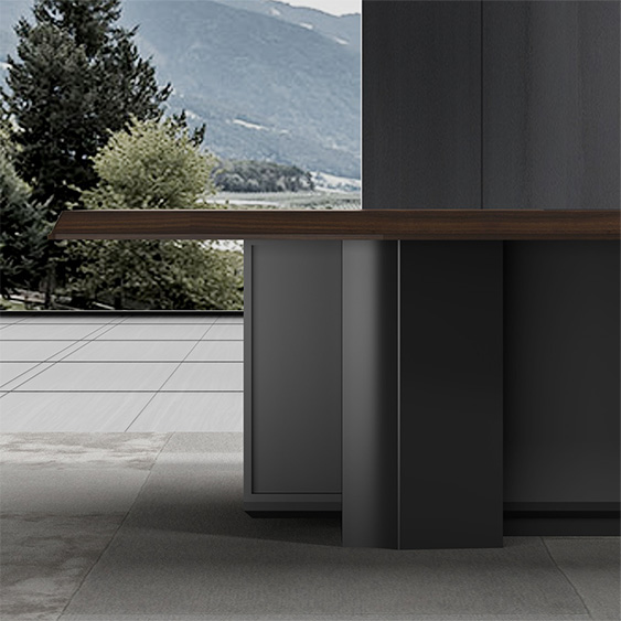 浩韵系列  深邃神秘,时尚富有魅力。态势沉稳又不失灵动,富有个性而不张扬。设计灵感源于建筑的倾斜式支撑给人带来的冲击感。不同材质的相互碰撞,实木结合金属嵌件,充满现代气息。在现有的办公功能上结合隐藏的电动升降台,将科技与美学完美结合,打造时尚简洁的现代化办公空间。